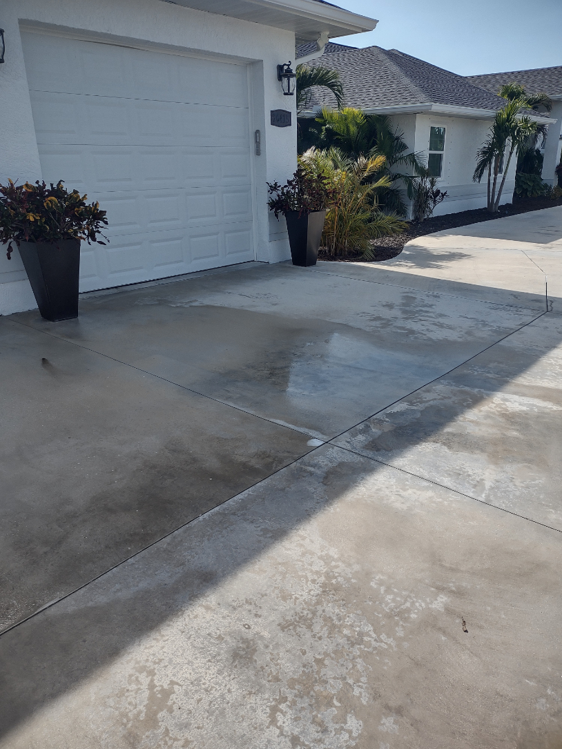 Driveway cleaning call from client. Driveway had really nasty tiremarks from husband's truck. She had another company come out and they couldn't get the Tiremarks out. We used a strong degreaser and attacked it aggressively and came out with great results. Client was very pleased.