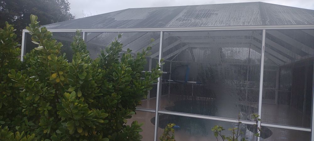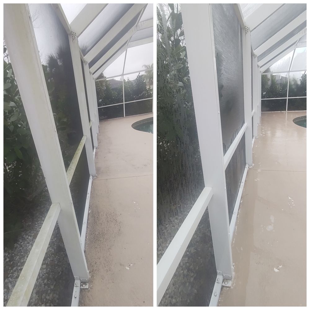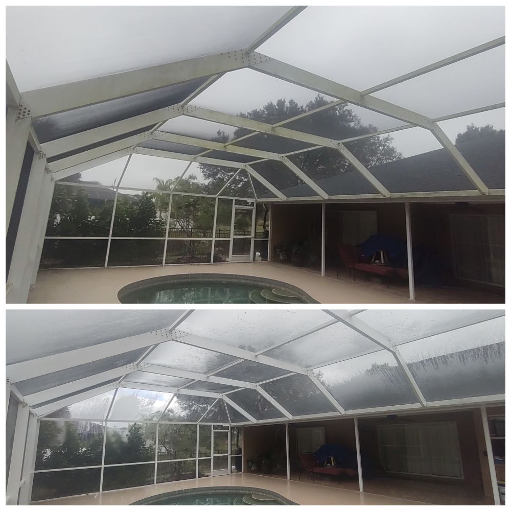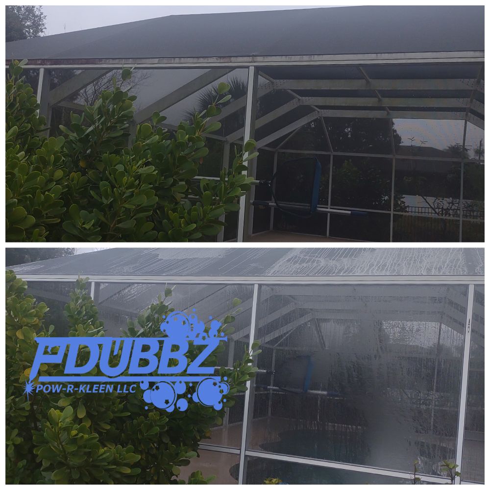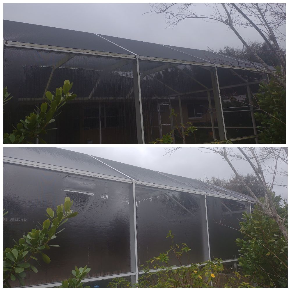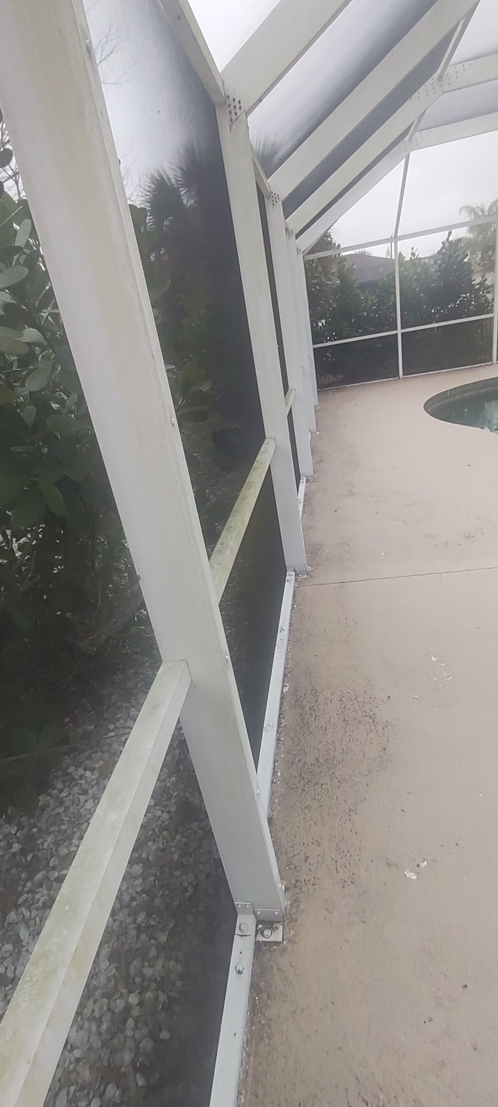 Client just recently purchased this home and desperately needed a pool screen cleaning service . There was mold, algae , and pollen buildup which made this green-yellowish film (a.k.a. The Green Nasty ). This unsightly buildup was all over the railings and made the lanai enclosure very unappealing and carried some health hazards as well. We applied our algaecide to the railings and screens both inside and outside the enclosure. All the filth, grime, and organic matter was safely removed during our softwash Process. Our Pool Screen Cleaning service is 5 ⭐ Rated and this project ended like all the others, a minty fresh pool cage and another satisfied customer.